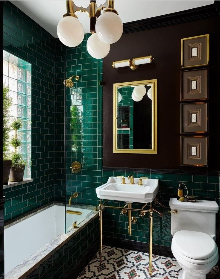 Tiles come in a variety of rich patterns that can act as art in a bathroom bringing enticing colors and patterns to the space. A beautiful example is the Palazzo Margherita in Italy, owned by Frances Ford Coppola. Designer Jacques Grange gave each room and bathroom its own individual look. Here, exceptionally stunning tile, sponge painted walls, marble moldings, and soaring richly patterned ceilings create an alluring space.